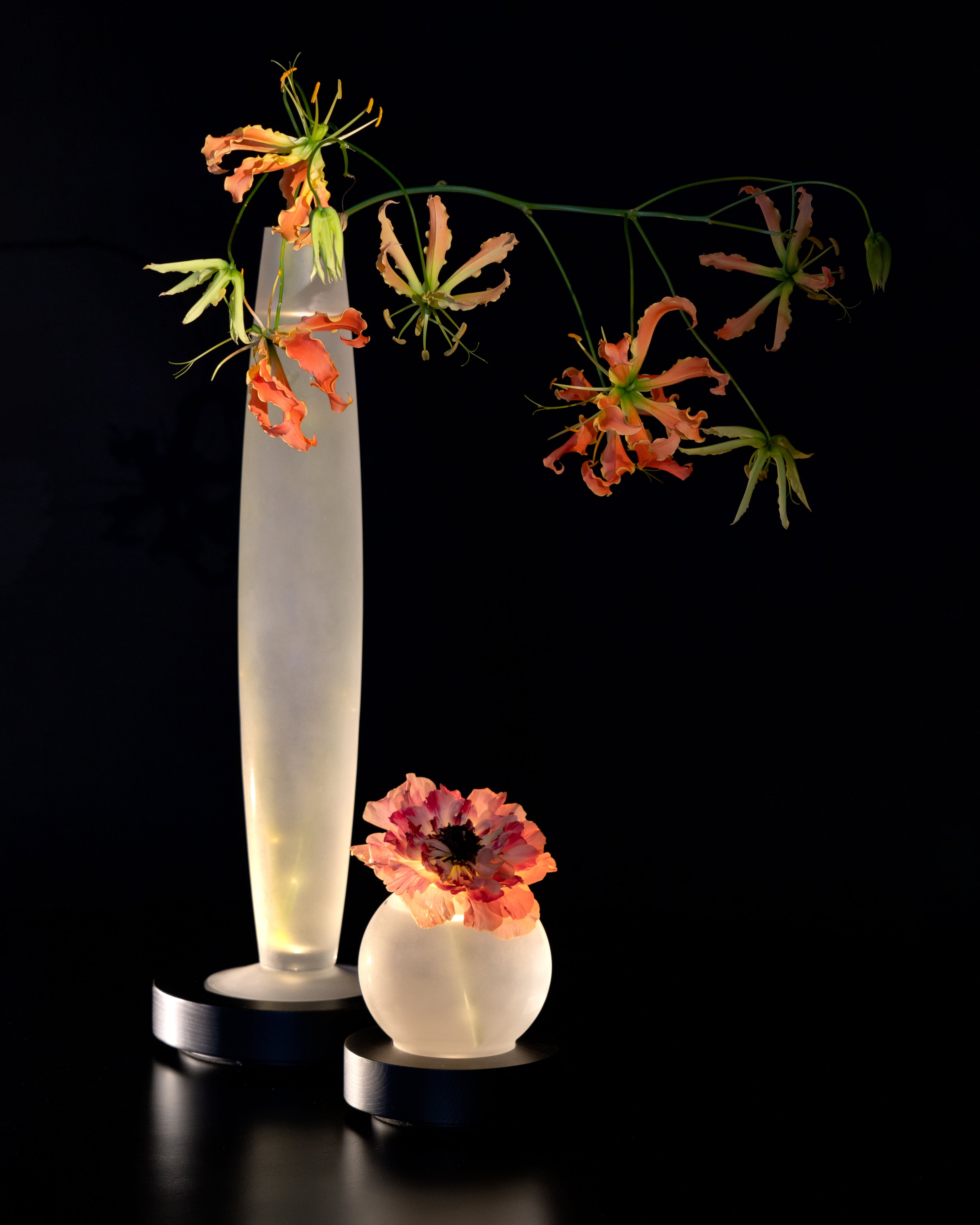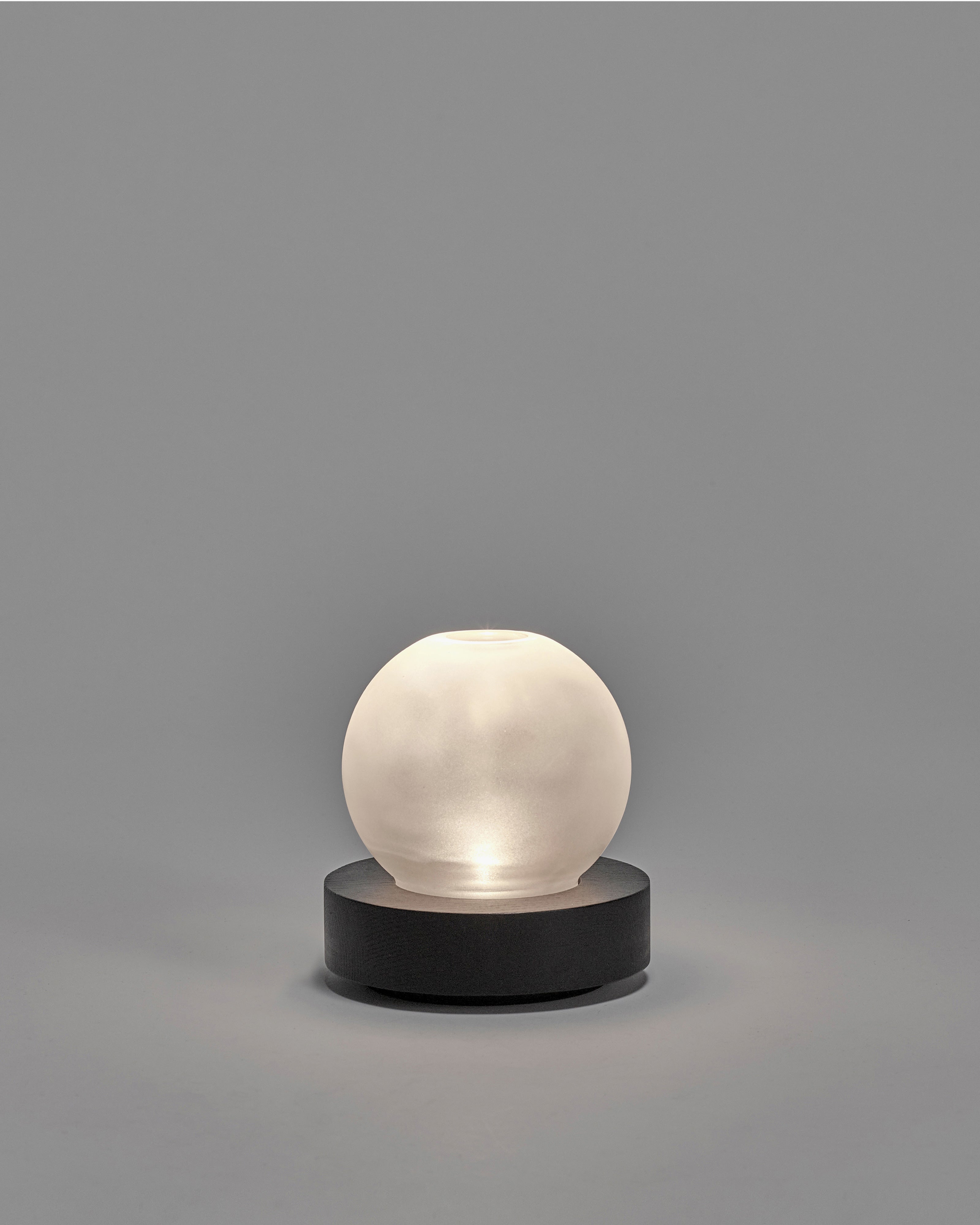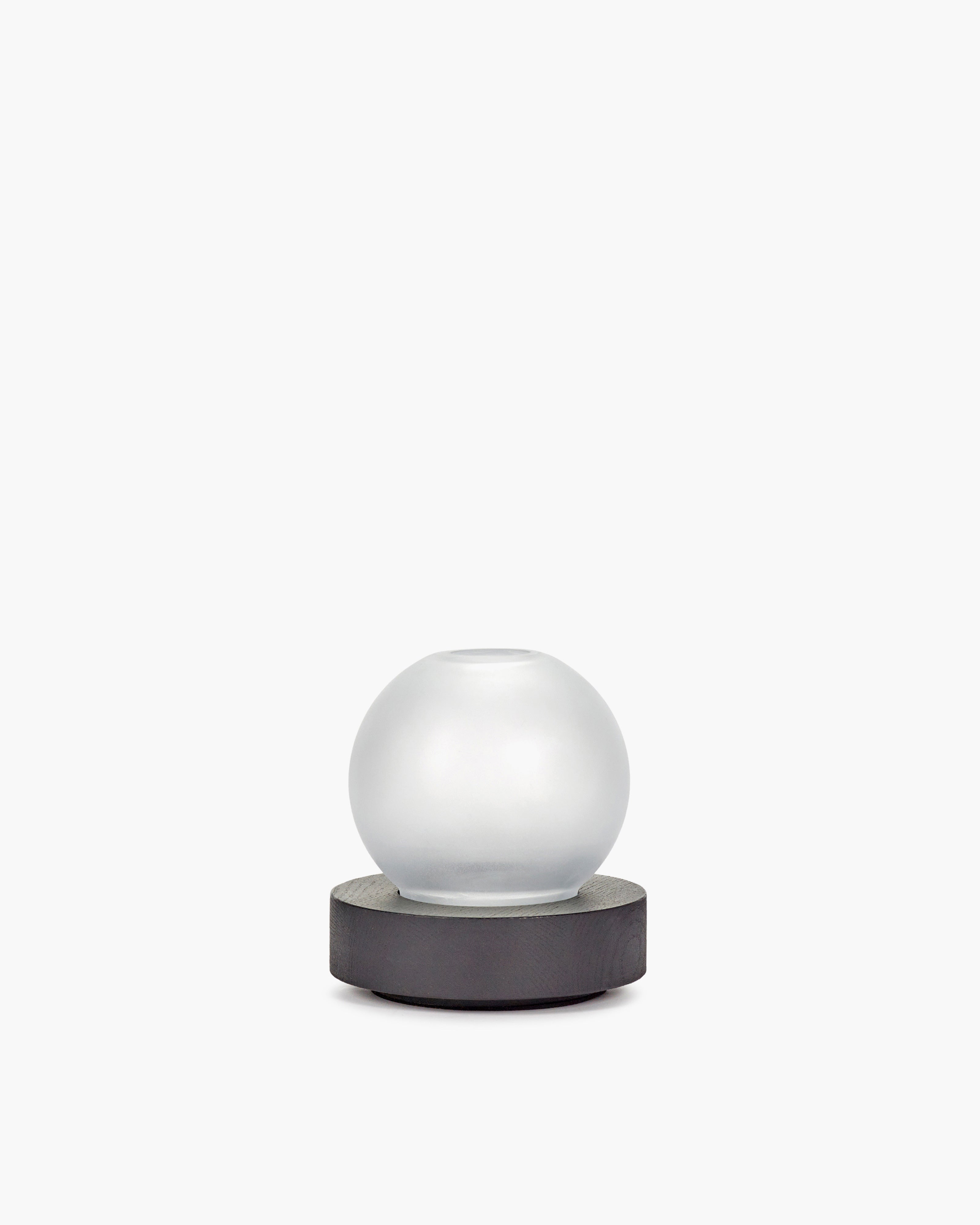 The LARA vase follows the same principle as the LYS: it is a vase in a sandblasted glass with a rechargeable LED light source in the wooden base. The frosted glass directs the light into the petals. Charging is carried out via the wooden stand into which the vase can be placed. LARA is characterised by its convex shape. The vase’s top opening is not overly big so that even larger or single flowers can stand up easily.
